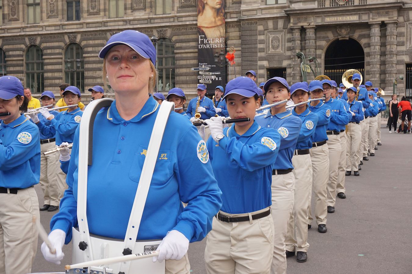 走在欧洲天国乐团鼓队里的德国法轮功学员克里斯汀(Chritine)说:“我从二零零一年就开始修炼。在修之前一直在寻找着生命的意义。生命最终是要结束呢?还是会继续存在下去?从很小的时候就在寻找这个答案。修炼了法轮大法后,所有的答案都找到了,也知道了自己生命的意义所在。”她说:“今天参加活动是想让世人知道法轮功在中国遭受迫害的信息,希望能够结束这场迫害。”