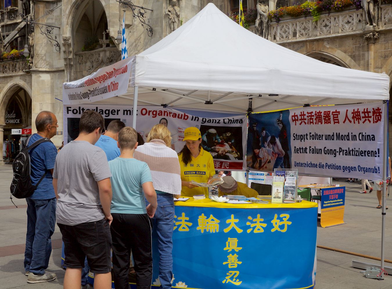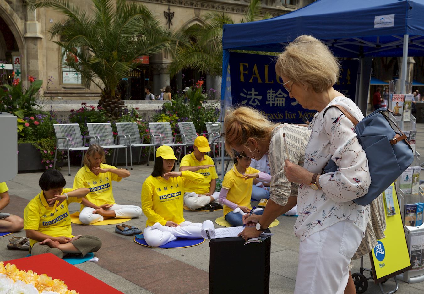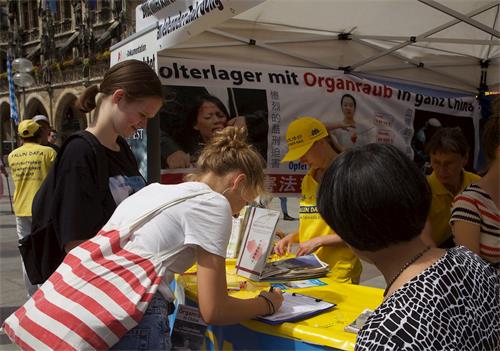活动中,学员的功法演示向人们展示法轮功的美好,大型横幅向中国游客传递信息,法轮功弘传世界、揭露中共活体摘取法轮功学员器官、退出中共的重要性等信息,希望他们能远离中共,为自己创造出美好的未来。了解真相的人们纷纷签名上书德国政府,敦促德国政府帮助制止中共迫害法轮功。