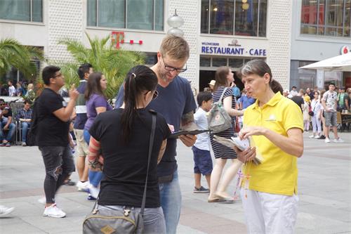 几位德国法轮功学员跟一位大陆出生、目前在慕尼黑从事艺术方面工作的年轻女士交谈了一阵子之后,她同意退出中共组织,她表示自己一直觉得中共很坏。