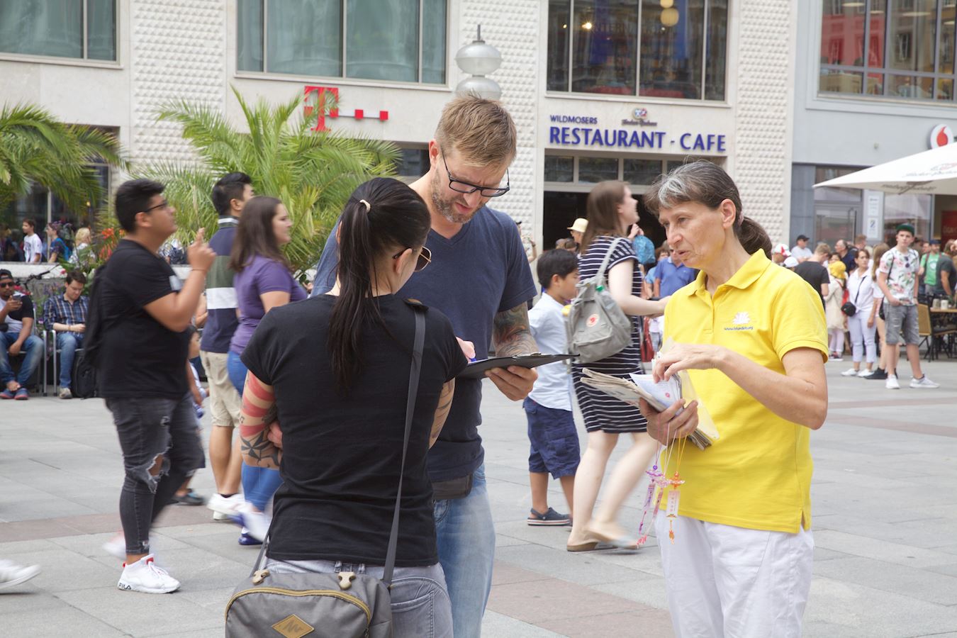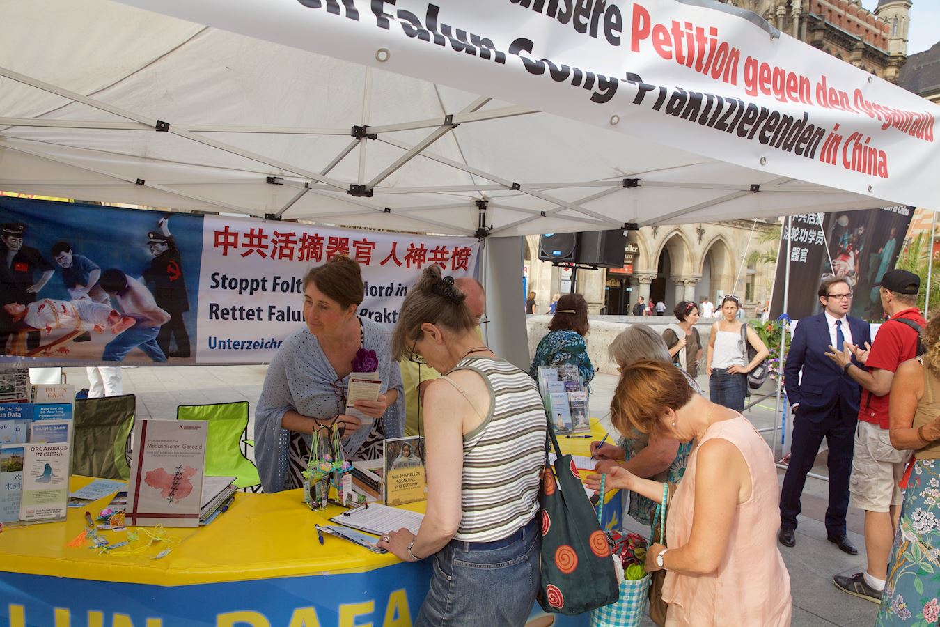 社会工作者斯特凡·施密德(Stefan Schmider)和同伴也是主动前去签名,他说自己经常从媒体和报纸读到和听说中共活摘法轮功学员器官的消息,他说:“现在我在这儿看到了这个场景”,所以他要签名声援法轮功学员反迫害。