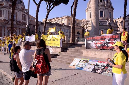 当天下午,在罗马著名的威尼斯广场(Piazza Venezia)继续举办反迫害活动直至傍晚,威尼斯广场坐落在罗马帝国广场大道(Via dei fori imperiali),是罗马最著名的游览胜地之一,每天从世界各地来此观光的游客络绎不绝。学员们不断地告诉人们法轮功是什么,揭露中共如何残酷迫害法轮功,活摘法轮功学员器官牟利的罪行,过往行人中有的用手机拍照,有的停在真相展板前仔细阅读每一张真相图片,