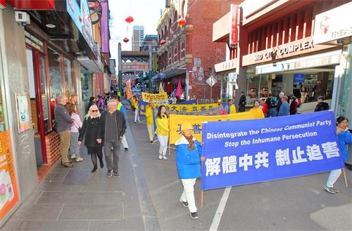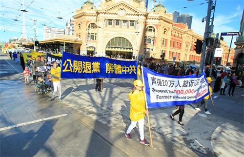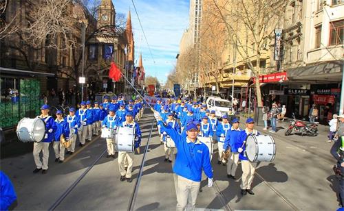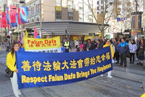 游行队伍共四个方阵,以天国乐团为先导,其后分别是“法轮大法好、大法洪传”、“解体中共结束迫害”、“退党保平安”等方阵,把法轮大法的美好、法轮功和平反迫害二十年的历程展现给墨尔本民众。