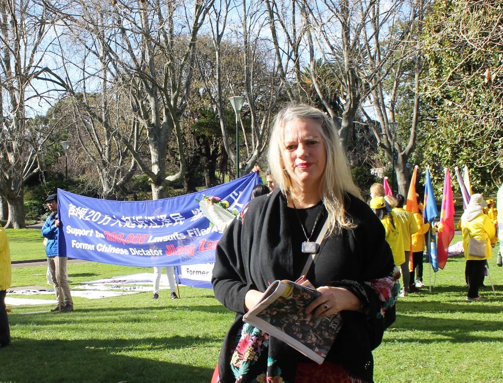 约了朋友在市中心聚会的前知名乐队主唱、词曲作家伯纳德(Rebecca Barnard)女士,被腰鼓队练习时清脆的鼓声吸引,来到游行的起点维多利亚女王公园(Queen Victoria Park),进而了解到法轮功和当天的活动目的。