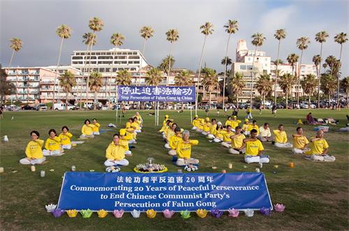 '图1~2:美国圣地亚哥部份法轮功学员在著名的拉荷亚海滩,举行了纪念法轮功和平反迫害20年的系列活动'