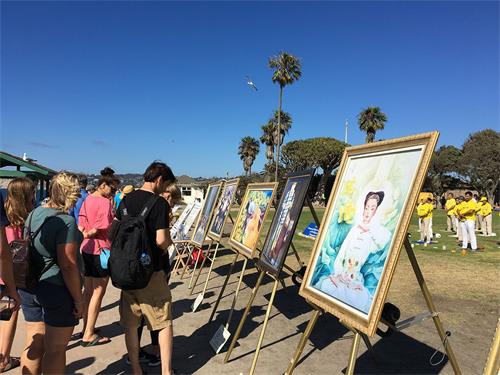 当天风和日丽,游人如织。在濒临大海的绿色大草坪上,身着黄T恤的法轮功学员平静祥和的炼功场景吸引了路人的目光;很多人认真地读着展板上的内容,并被反映法轮功学员修炼和反迫害的油画所感动。