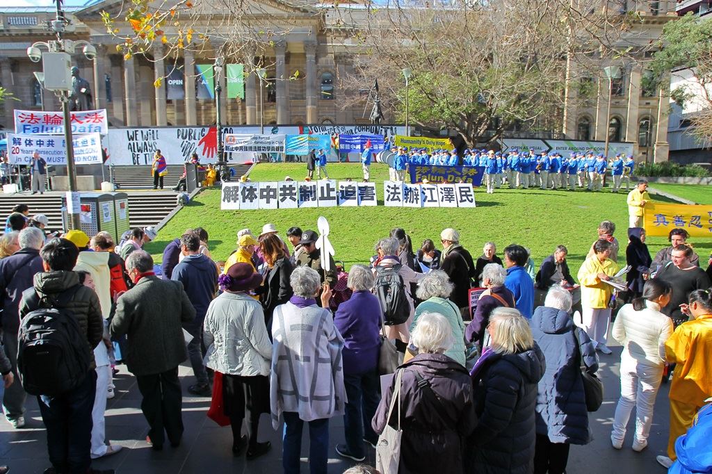 维州法轮大法学会会长樊慧强先生在集会中表示,中共对法轮功学员的迫害遍及全中国,数万人被判劳教、关进精神病院,受到强制洗脑等各种形式的迫害。“明慧网数据显示,在2019年上半年,超过两千名法轮功学员被捕,其中至少335人被判刑,此外,还有更多法轮功学员受到反复骚扰”。