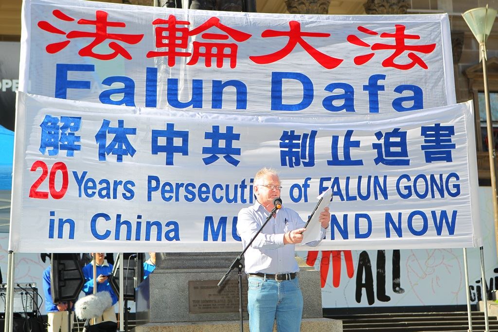 前澳洲民主工党(Democratic Labor Party)维州副主席杰勒德‧弗拉德(Gerard Flood)先生在发言中提到,“独立人民法庭”于伦敦举行的终审判决,判定中共政府对以法轮功学员为主的良心犯进行大规模器官摘取,无可置疑地犯有危害人类罪以及酷刑罪。法庭认定中共治下的政府是一个犯罪政权。