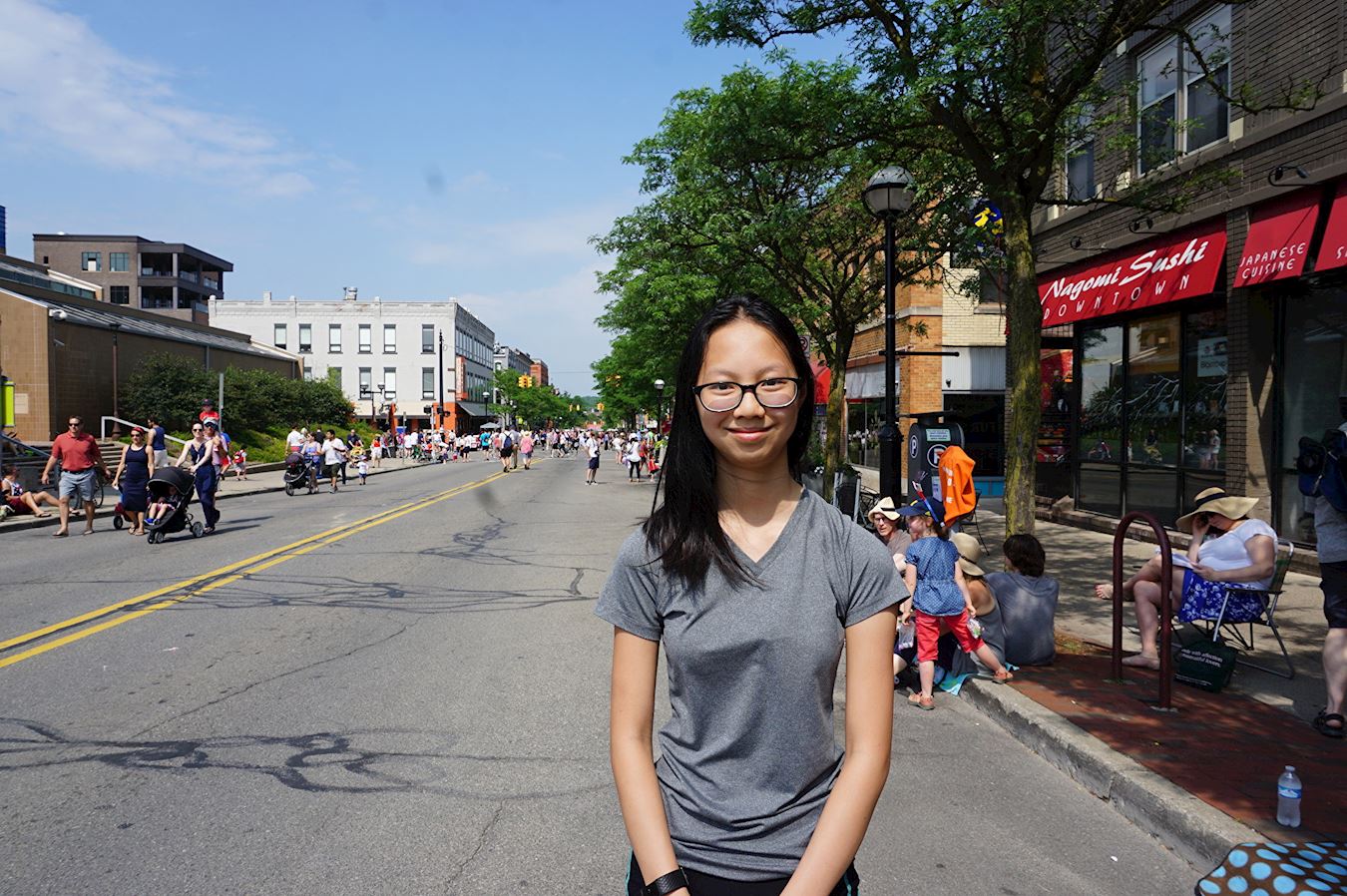 莫伊(Marieooe Moi)是一位日裔女士,她从亚利桑那州来看她的妹妹一家的。这是她第一次观看安娜堡的游行,她说:“太棒了。我们很享受。特别喜欢中国人的游行队伍。莲花花车很漂亮。颜色很美,我喜欢。”