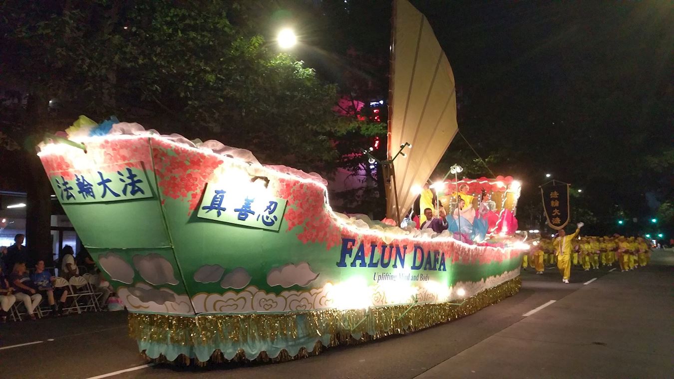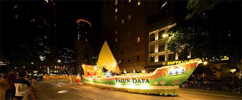 法轮功学员的“大法船”花车由两名威武的“唐朝武将”护航,在游行大道上浩荡航行。法船花车长四十七呎,宽十二呎,高十呎,船帆升起高达二十五呎。这艘“法船”花车,自二零零五年首次出现在海洋节游行以来,参加了包括海洋节游行及其它北美西北部规模最盛大的游行三十多次,获十数个大奖项。海洋节主办方主任曾经称赞法轮功是西雅图地区第一个自行设计并亲手制作花车的团体(不同于其它团体雇用专业公司制作花车),因此而带动了其它社区团体也来亲手制作自己的花车。美国和加拿大主流电视台及报纸多次采访报道该花车,或以之为亮点预告当年即将到来的游行。