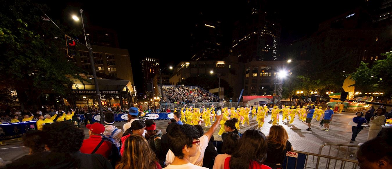 在“法船”花车之后,是由四十多名法轮功学员组成的腰鼓队,布开方阵。他们头裹黄色头巾,身着金色炼功服,腰系粉色腰带,整体色彩鲜艳明快。腰鼓队员年龄不等,个个都面带微笑,神采飞扬,步履轻松,在领队响亮清脆的钹的指挥下,他们表演了“法轮大法好”和“喜庆”,今年还特别增加了“天灭中共”的新曲目,以庆祝三退(退出中共党团队)人数超过三亿三千万。