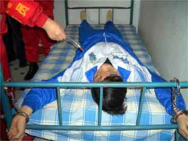 ![]() 酷刑演示:手脚都铐在铁床上 |