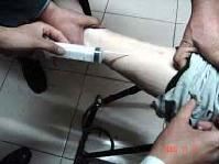 高压电击:狱警一人或多人同时用电棍电击头,脸、眼睛、脖子、胸部、手上、全身及敏感部位,烧出肉焦味来。有的被电击后眼睛青肿、严重充血,视物不清。