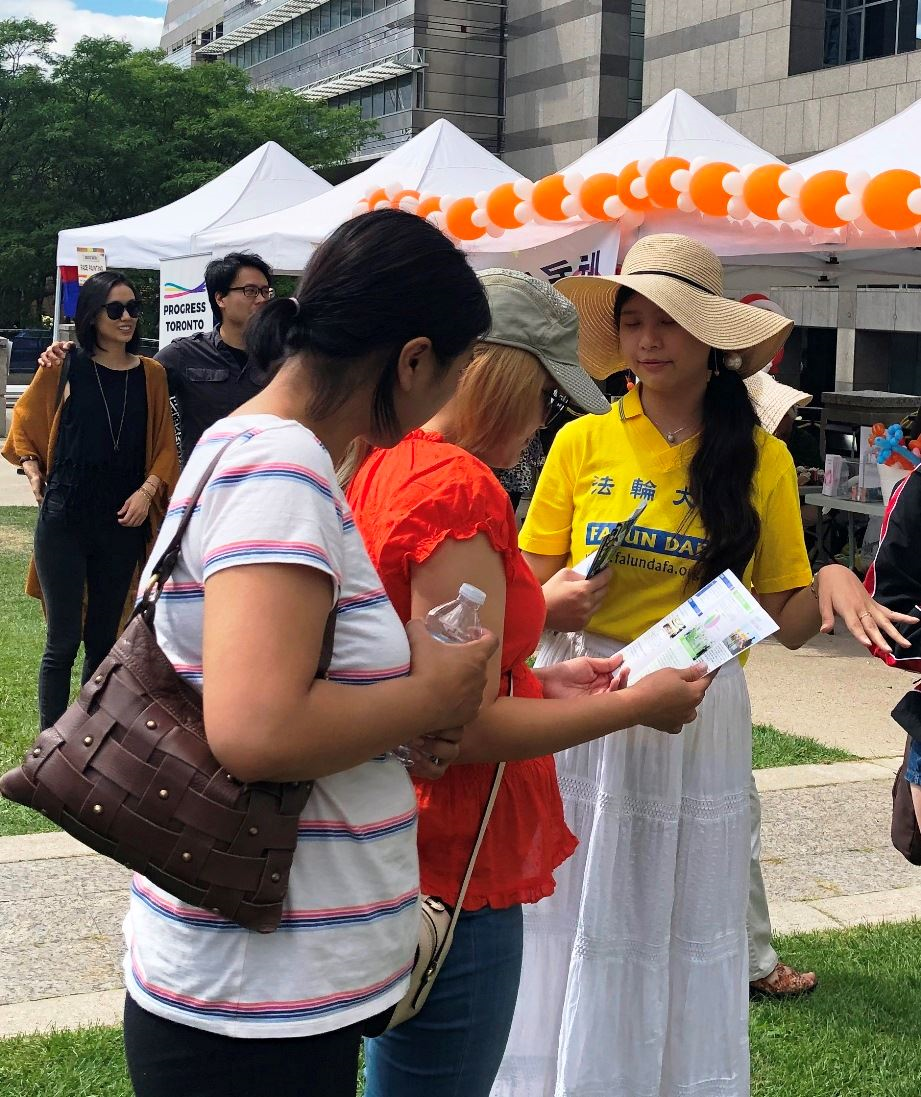 一对移民加拿大七、八年的大陆老夫妇走到法轮大法展位前想要获得炼功点的信息。太太询问学员说:“我想要知道在哪里学功,我们家附近有没有炼功点?我听说这个(法轮大法)效果特别好。”