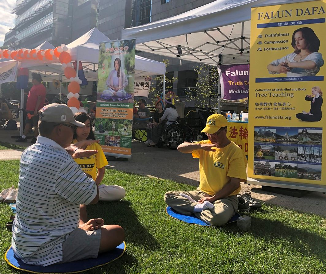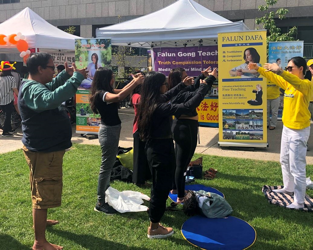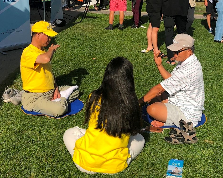 多伦多居民凯伦(Karen)静静地站在展位前看着法轮功学员打坐。学员问她是否想试一试,她于是欣然加入其中。单盘了二十分钟,随后凯伦还学完了第一至第四套功法。她说打坐和炼动功时她都感觉很棒,“我感受到了强大的能量,尤其是在手换位置的时候,能量很强。”临走前,凯伦报名想参加法轮大法九天学习班。