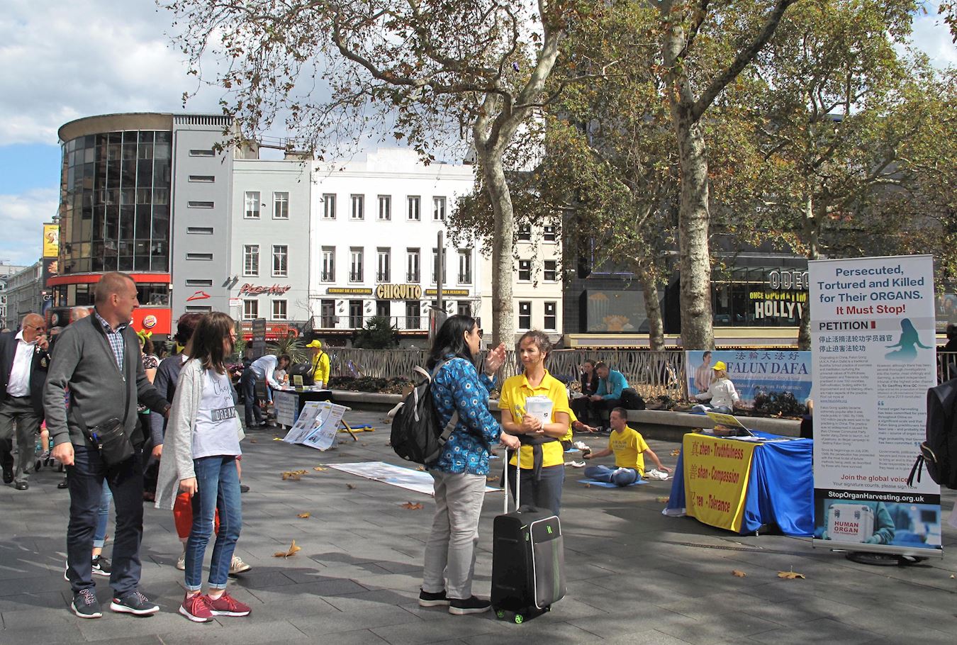 图3~4:二零一九年九月一日,欧洲法轮功学员在莱斯特广场(Leicester Square)传播法轮功真相,吸引众多民众关注。
