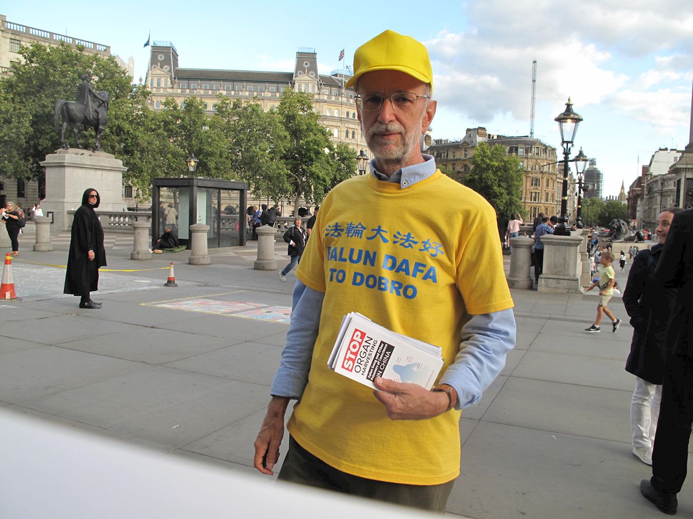 十几年前开始修炼法轮大法的波兰法轮功学员约斯(Jas)前来参加在伦敦召开的欧洲法会及相关讲真相活动。他在鸽子广场上给过往的人们发送大法真相资料,他说:“我不想错过经过身边的每一个人”,“我发现在我们发传单时,很多人直接来找我们了解真相。”