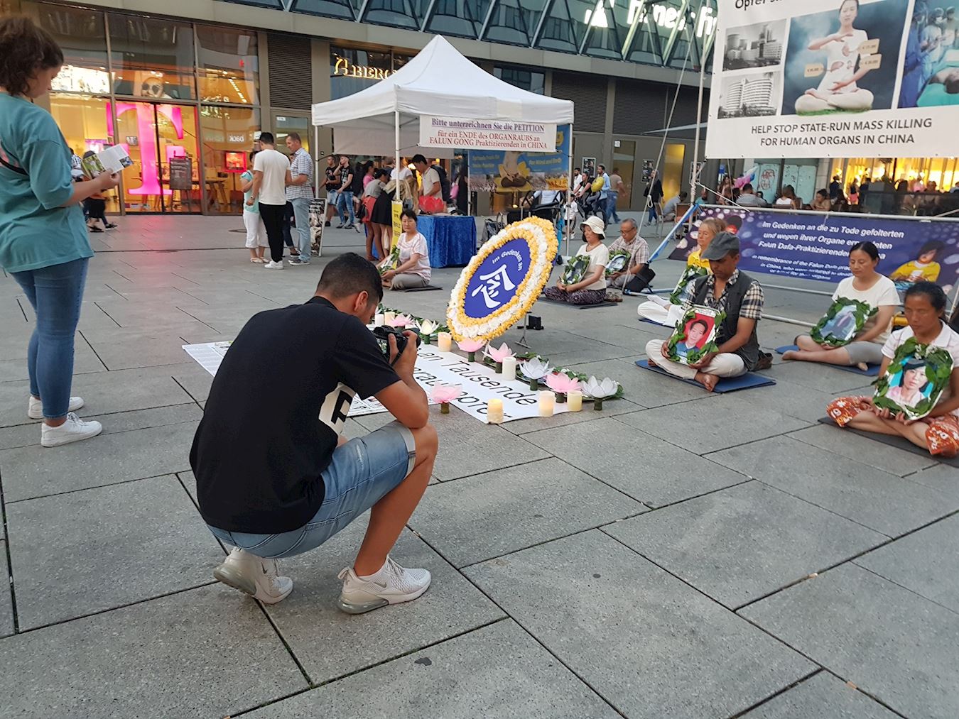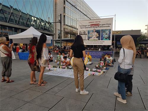 ![]() 图1~2:2019年8月31日,法轮功学员在法兰克福商业大道上举办烛光守夜活动,引来路人的关注 |