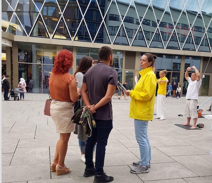 一位西方中年女士第一次听说法轮功,想了解中共对法轮功学员做了什么。法轮功学员告诉她,中共为达到迫害法轮功的目的,铺天盖地编造假新闻,诬蔑、诽谤、嫁祸于法轮功,挑起民众的仇恨。这位女士听后,频频摇头表示反对。法轮功学员还告诉她,中共自一九九九年迫害法轮功以来就大量活摘法轮功学员的器官,把人当牲畜一样的宰割,以达到消灭法轮功学员,同时从中牟取暴利的目的。