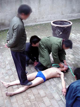 狱警覃建和吴金生直接参与了迫害,他们指使七个包夹犯经常对刘志荣拳打脚踢和辱骂威胁。有一天晚上几个包夹将被打得有气无力的刘志荣抬到水房里,把刘志荣衣服脱光,用冲厕所的水管冲他。晚上冲水的声音很大,犯人们都听得到,因为影响了其它监舍的人睡觉,引来怨声一片。北方一月的天气,可以想象被冰冷刺骨的水冲打是何等滋味。而泯灭人性的施暴者还在一旁不停的嘲讽,近在咫尺的狱警却充耳不闻,听之任之。