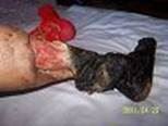 狱医张俭红第二天看了宋会兰的右腿后说:“这条腿废了。”当时宋会兰的右腿起了大紫泡。回家后,宋会兰身体僵直、眼神发呆、不会说话,手、腿直挺挺的,不能回弯,象木头人一样,没有任何反应和知觉,右腿以下,脚面、脚趾全部坏死,呈黑色,淌血水,摸上去硬邦邦,象铁板一样,一敲砰砰响。一天比一天恶化,越来越黑,越来越硬。一动弹,就顺着腿淌血水。