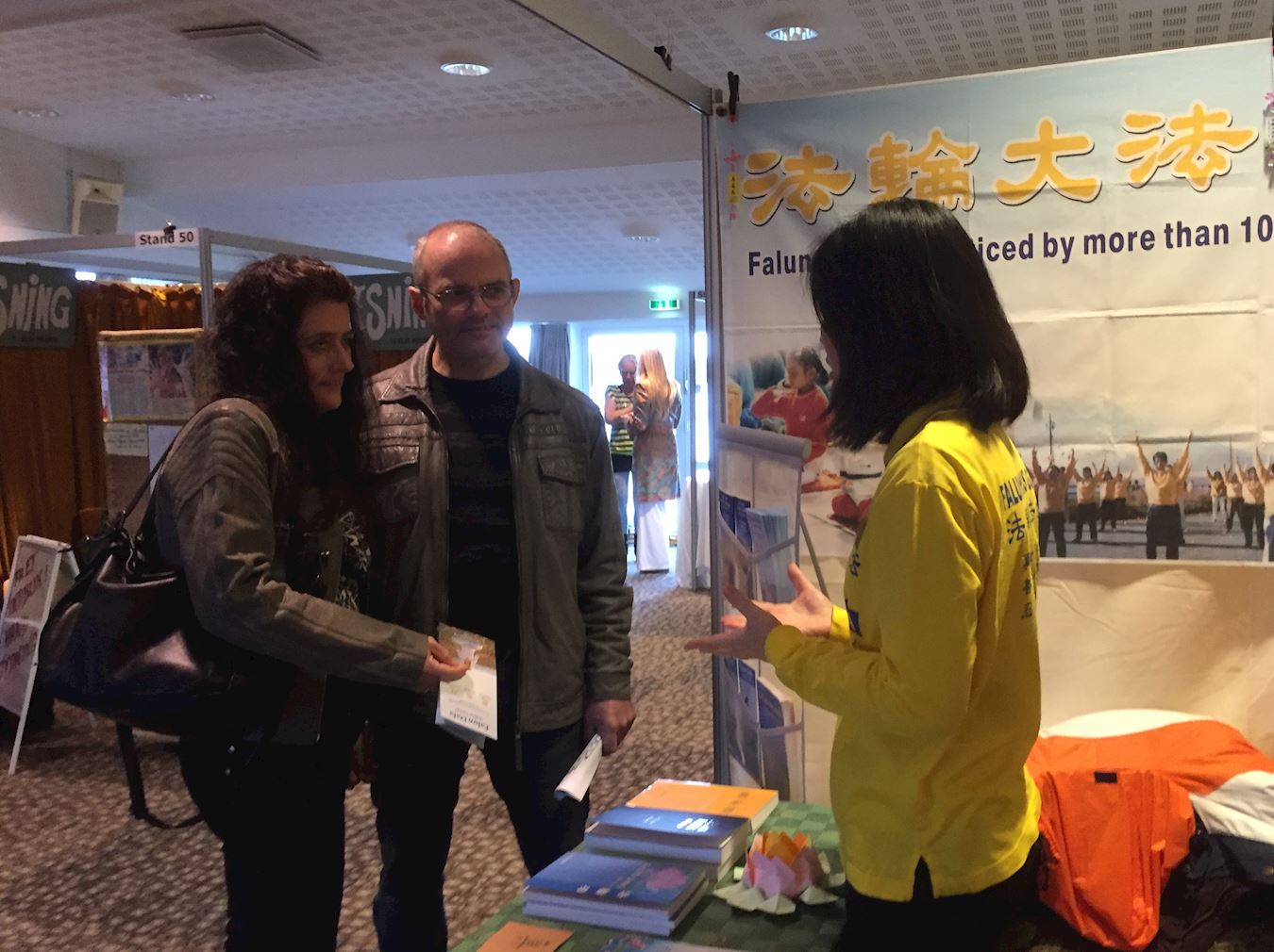 简妮(Jane)感觉法轮功的展位有一种吸引力,看到后就径直走来。当她得知法轮功,真善忍等资讯后表示:“我看到你们展示的功法,有一种回家的感觉,我想学法轮功。”