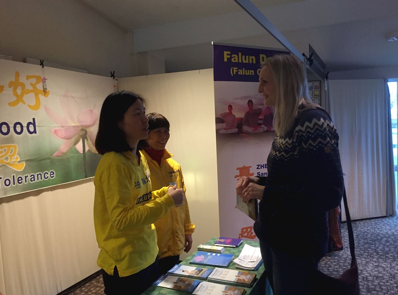 参展商约瑟芬妮(Joephine)的展位在法轮功展位对面,当她那边没有客人时,她都把目光转向法轮功这边来,微笑着静静地看学员展示功法。下午快结束时,学员到她的展位,送给她写有“法轮大法好”的小莲花和法轮功简介。她很高兴地表示想学功,写下她的联系方式。过了一会儿,她又来到法轮功展位看还有什么资料,想了解更多。她看到一份有关法轮功对健康有益的报告时说:“好象我没有得到这个资料?我可以拿吗?”自然她如愿以偿。
