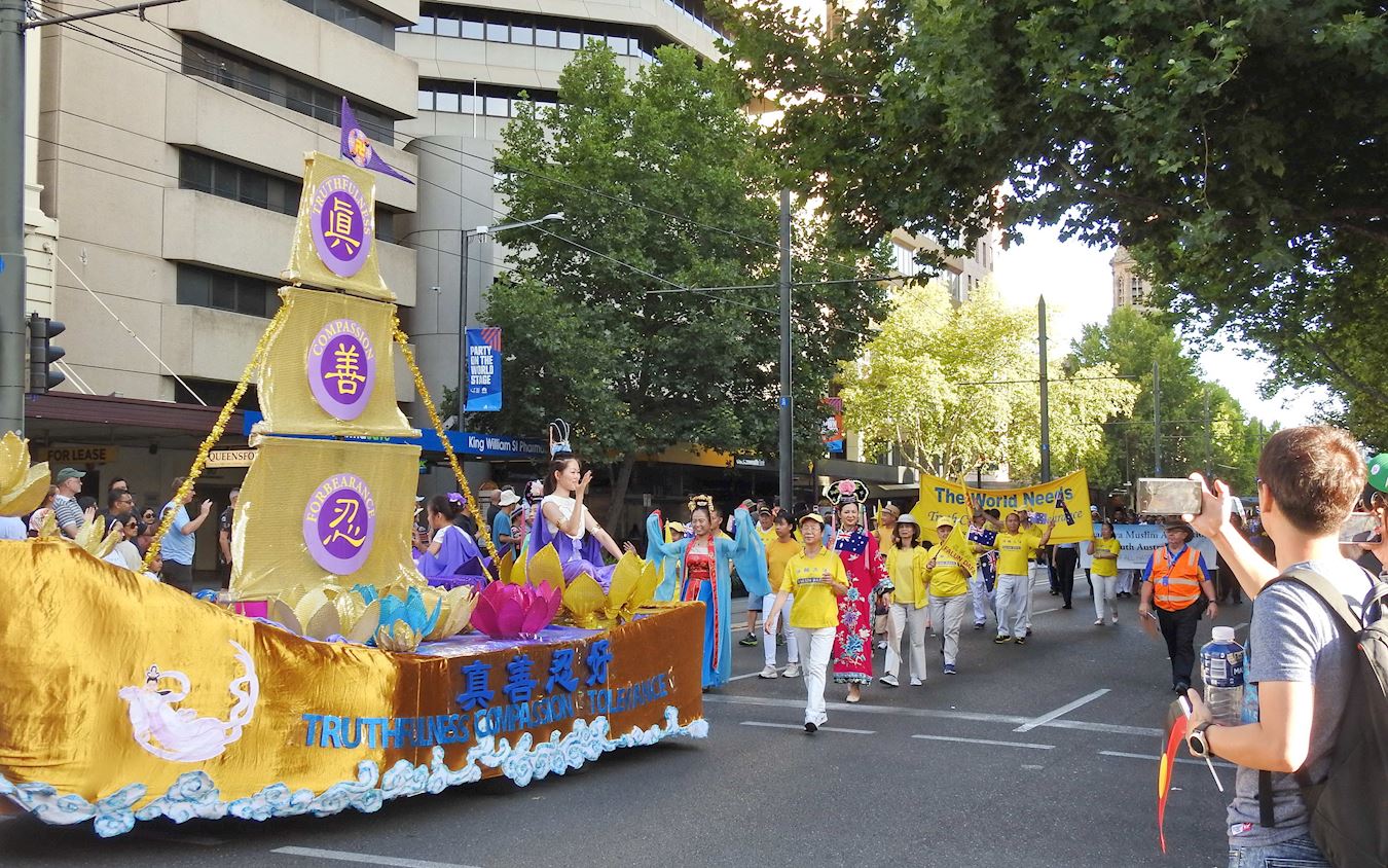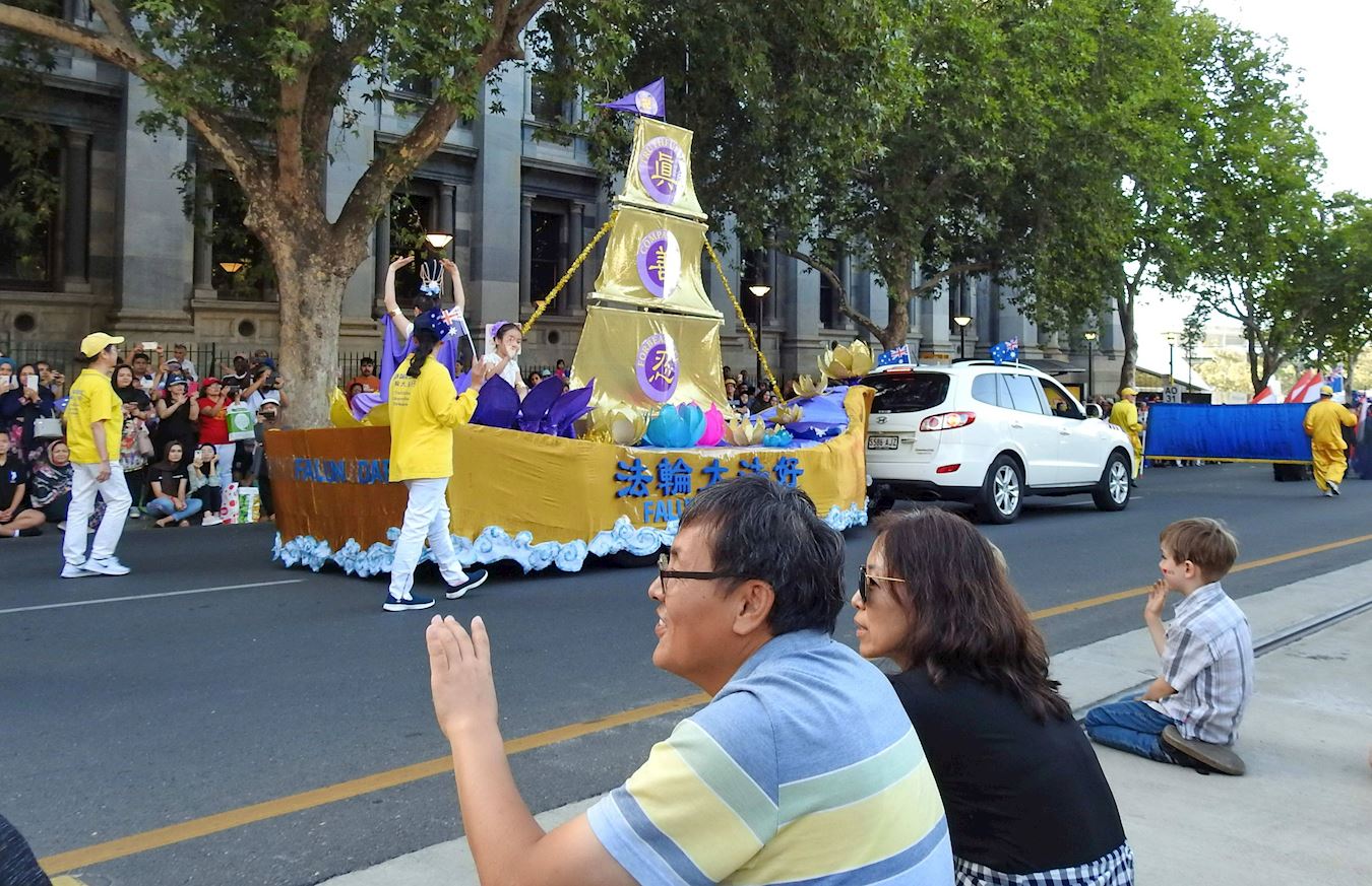 法轮功游行队伍走过观礼台时,台上不少政要嘉宾频频和法轮功学员招手互动。主持人介绍说:今年南澳本地的法轮大法团体为我们带来一艘他们手工制作的特殊金色法船。船帆上高挂着的“真善忍”三个大字是这个佛家修炼法门的基本原则。船上端坐着的仙子正在为我们展示打坐的动作。我们还看到华美的中国古典服饰。法轮功提供免费教功,任何人都可学炼。您可以在“南澳阿德莱德法轮功”脸书上轻松找到详细信息。