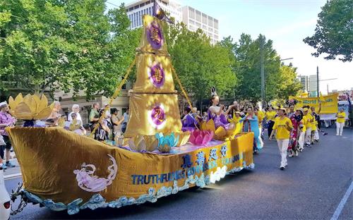 法轮功学员们今年带来崭新制作的金色“法船”花车,中英文“真善忍”、“法轮大法好”耀眼夺目。花车上仙女仙童分别端坐在金色和紫色的莲花中,展示打坐功法;其他的学员们身着亮丽的中华古典服饰和金黄色炼功服,向民众微笑祝福。