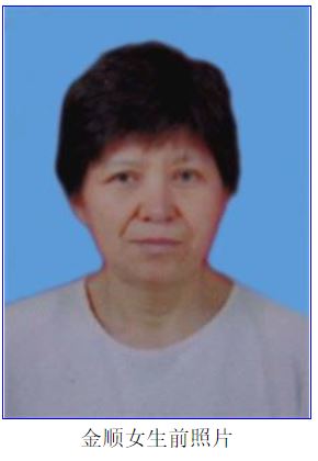 十月六日警察电话通知家属,说金顺女正在抚顺市中医院抢救,让家属赶快到医院来。当家属赶到医院时,看见金顺女已处于深度昏迷状态。新华街办案警察张坤让家属签字,并威胁家属说如不签字就重判,签了就放回家。金顺女的女儿见母亲处于深度昏迷状态,奄奄一息,救母心切被迫签了字。警察走后,尽管医生对金顺女进行了努力抢救,但一直没能醒过来。二零一八年十月十日早四点四分,金顺女离开了人间。