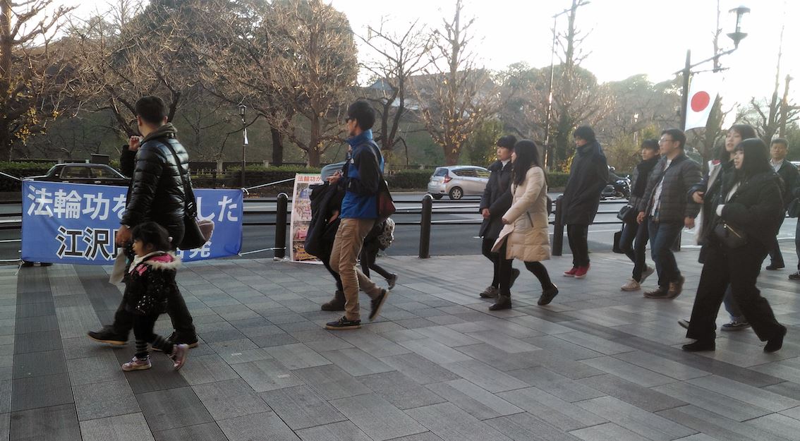 一月一、二日,“控告江泽民迫害法轮功”的横幅,高高地挂在地铁站到神社必经之路的两棵树之间。三日这天,“控告江泽民迫害法轮功”的横幅,满载世界各地法轮功学员游行彩照的 “法轮功弘传世界”看板被转移到东京神社地铁站出口,都非常醒目。征集声援诉江签名的录音也在播放。
