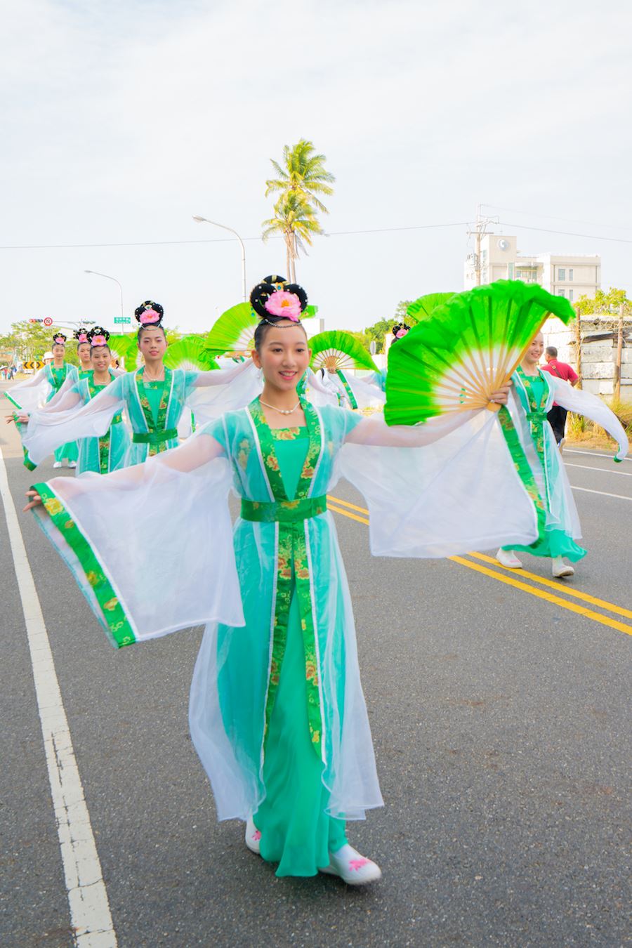 还有部份同修跟着游行队伍,沿街发送莲花吊饰和大法真相资料,让人们认识大法的美好。