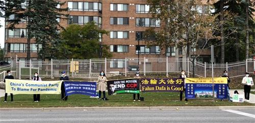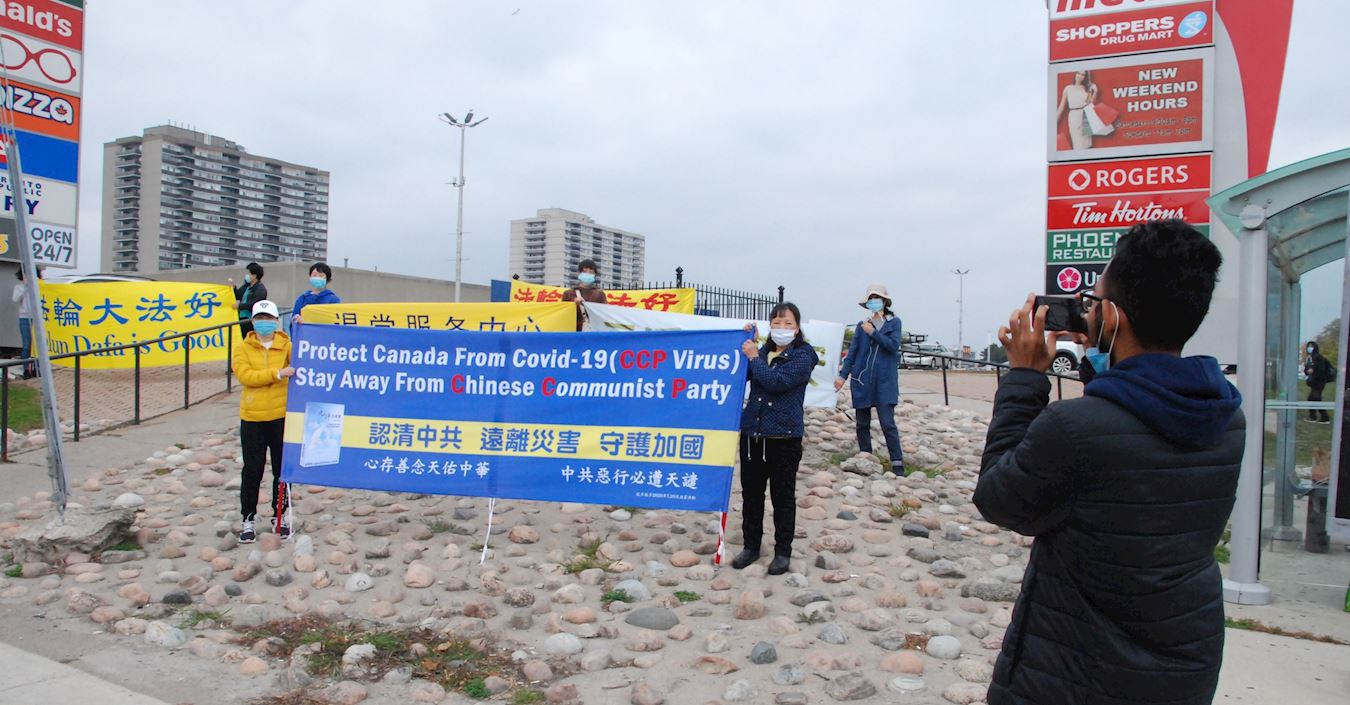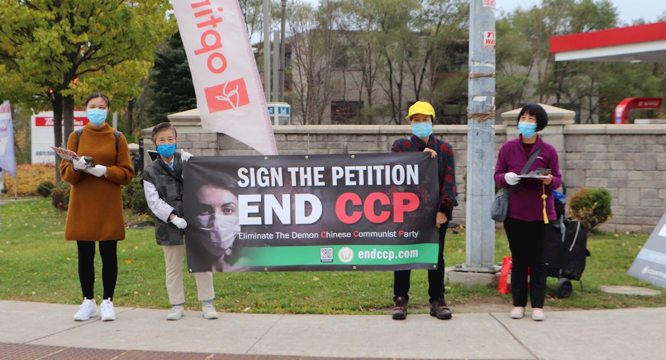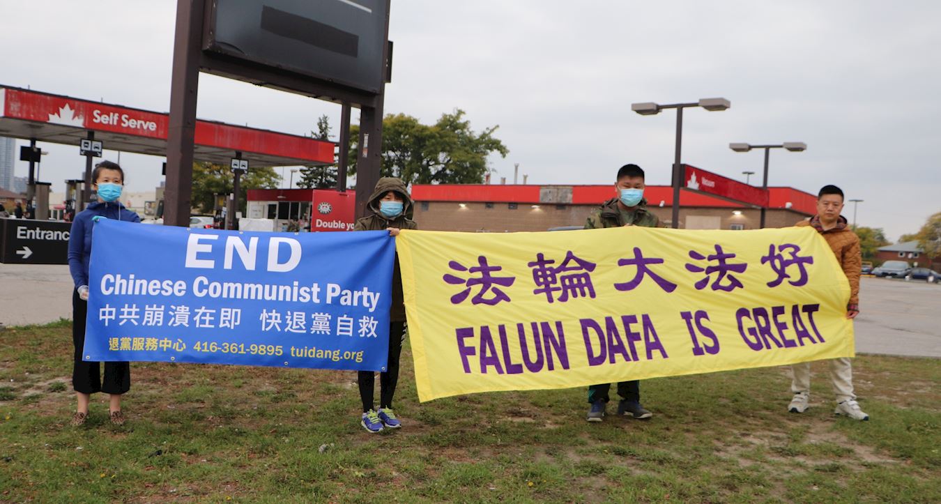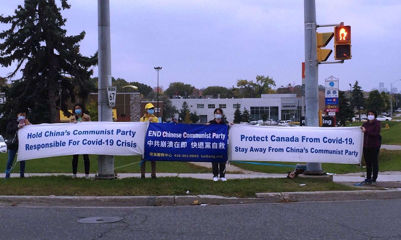 二零二零年十月十日和十一日,大多伦多地区的三十多个繁忙的大路口,作为退党义工的法轮功学员们打出横幅:“End of CCP”(终结中共)“The Ultimate Goal of Communism:Destroy Mankind”(共产主义的终极目的:毁灭人类!)“China’s Communist Party to Blame For Pandemic”。(中共必须为瘟疫大流行而遭到谴责!),“Protect Canada from Pandemic. Reject China's Communist Party”(保护加拿大免遭病毒,拒绝中共),吸引了很多民众驻足签名,现场三退(退出中共党团队)、拿相机拍照和表示支持。也有不少匆忙走过路口的人说:“支持你们!”“我同意!”“坚持啊!”“不要放弃!”