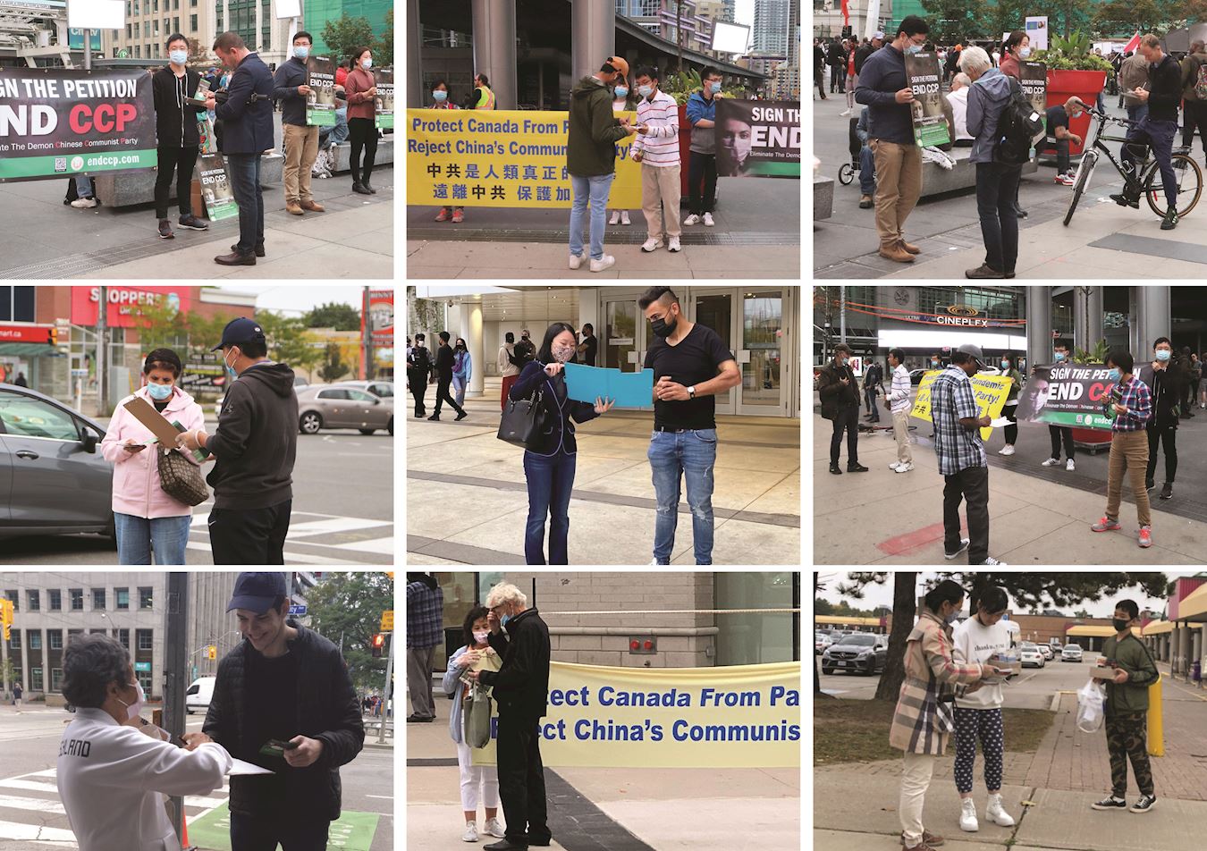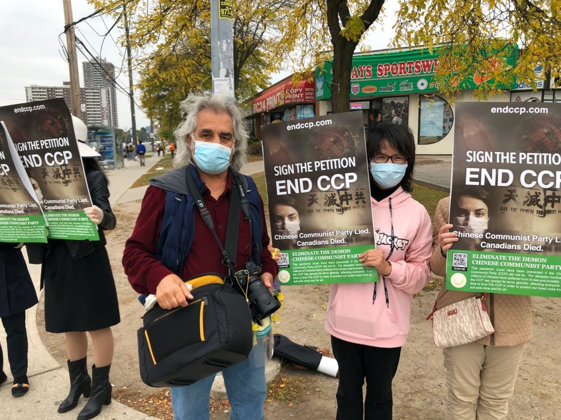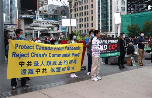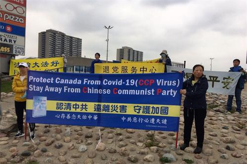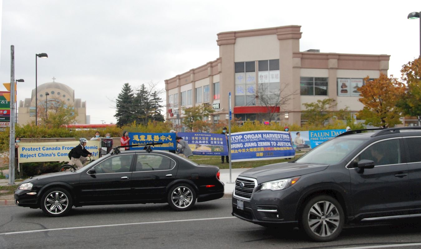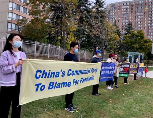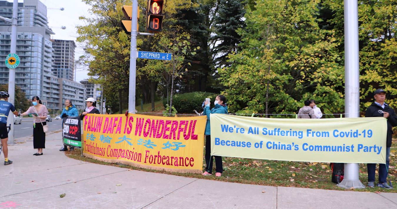 二零二零年十月十日和十一日,大多伦多地区的三十多个繁忙的大路口,作为退党义工的法轮功学员们打出横幅:“End of CCP”(终结中共)“The Ultimate Goal of Communism:Destroy Mankind”(共产主义的终极目的:毁灭人类!)“China’s Communist Party to Blame For Pandemic”。(中共必须为瘟疫大流行而遭到谴责!),“Protect Canada from Pandemic. Reject China's Communist Party”(保护加拿大免遭病毒,拒绝中共),吸引了很多民众驻足签名,现场三退(退出中共党团队)、拿相机拍照和表示支持。也有不少匆忙走过路口的人说:“支持你们!”“我同意!”“坚持啊!”“不要放弃!”