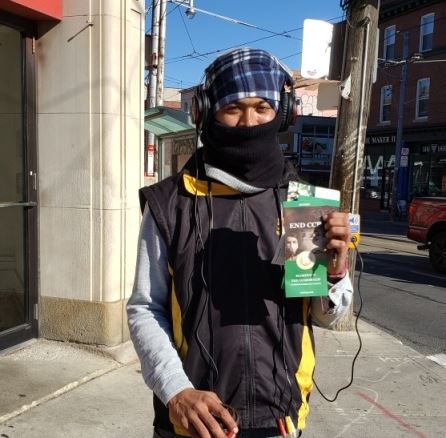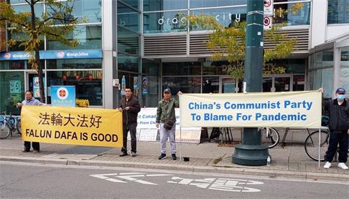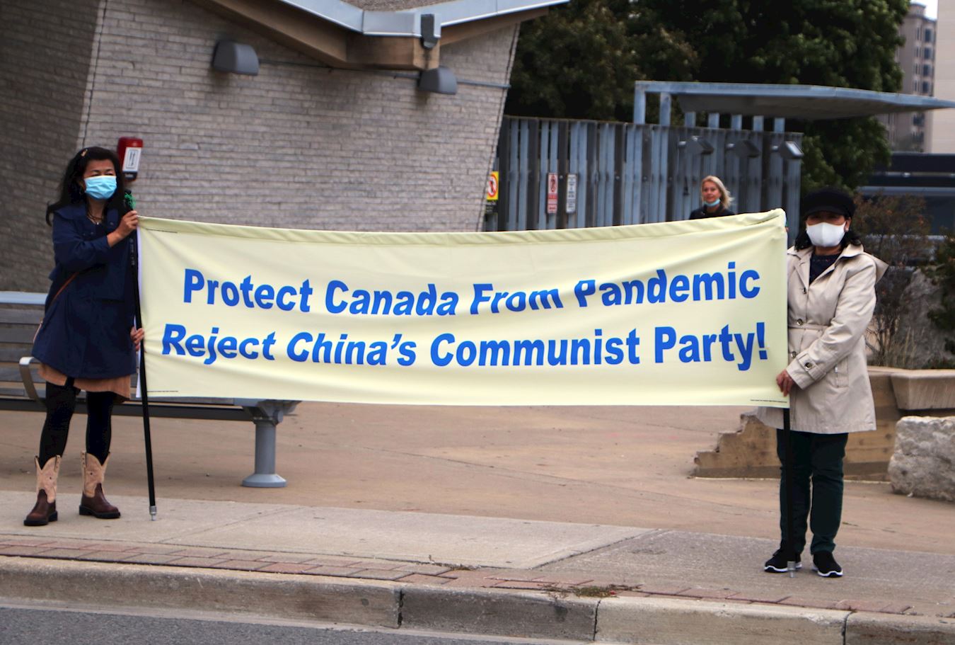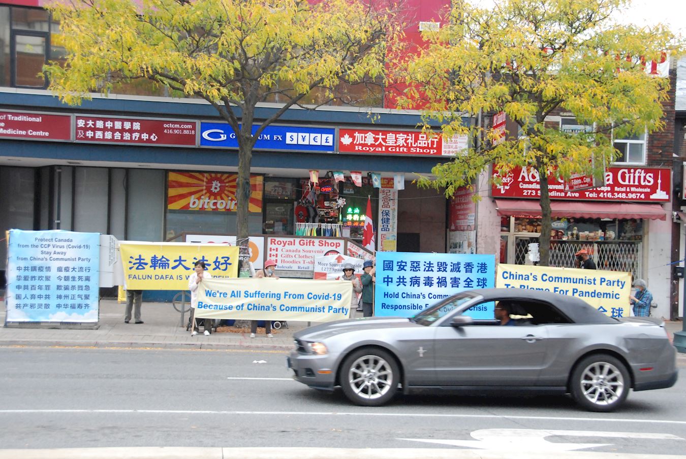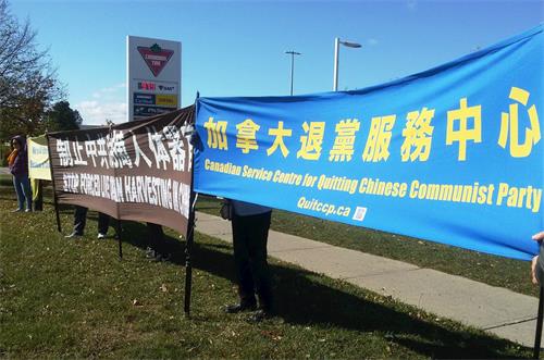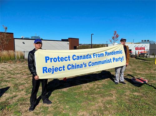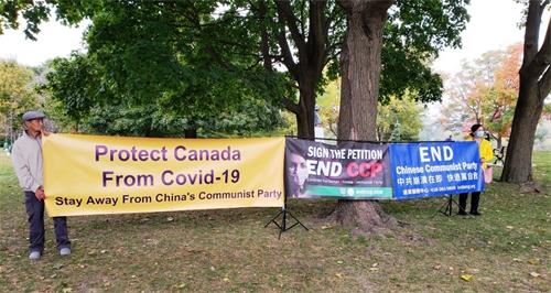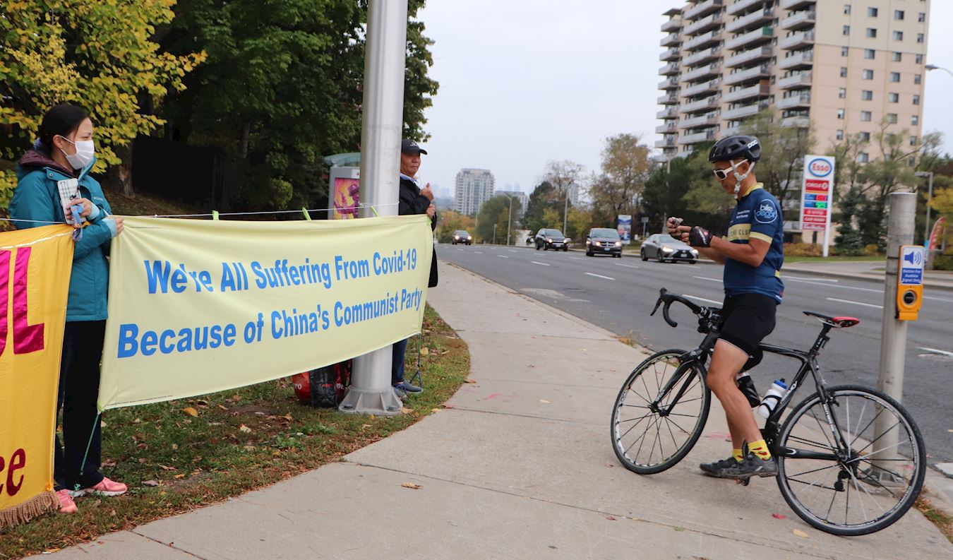 二零二零年十月十日和十一日,大多伦多地区的三十多个繁忙的大路口,作为退党义工的法轮功学员们打出横幅:“End of CCP”(终结中共)“The Ultimate Goal of Communism:Destroy Mankind”(共产主义的终极目的:毁灭人类!)“China’s Communist Party to Blame For Pandemic”。(中共必须为瘟疫大流行而遭到谴责!),“Protect Canada from Pandemic. Reject China's Communist Party”(保护加拿大免遭病毒,拒绝中共),吸引了很多民众驻足签名,现场三退(退出中共党团队)、拿相机拍照和表示支持。也有不少匆忙走过路口的人说:“支持你们!”“我同意!”“坚持啊!”“不要放弃!”