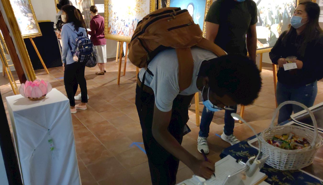 杰姆斯(James)是计算机系大学二年级学生,平时也看了许多网上的消息,知道很多。来到画展,他仔细的看了每一幅画,还长时间与学员交谈,了解询问更多信息。他说:很高兴来看画展和看到越来越多的人认识到了CCP的邪恶,所有它对法轮功、新疆、西藏人的迫害应该立即停止,我将继续努力传播真相。