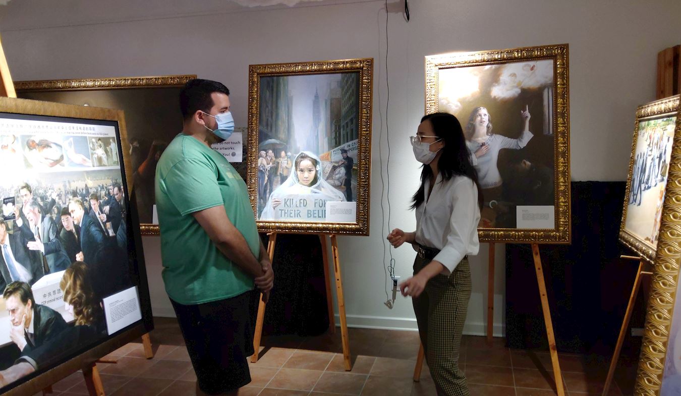 年轻女孩米娅(Mia)看画的过程中一直落泪不止,随后与学员交流了长时间了解更多有关法轮功的事情。她说:“画都太美了,对主办这样的活动让我有机会看到发生在中国这种侵犯人权、引起人们的关注的人非常感谢,虽然看那些画(指表现法轮功学员被迫害的情景)时心里真的不好受,但正是这些在告诉我们、提醒着我们所有人,离开了法轮功信仰的核心原则(真、善、忍)世界会变成什么样。”