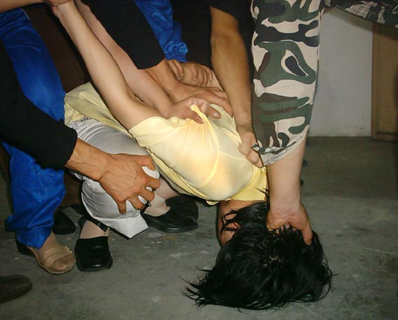 2001年7月10日,我因为连续几天缺少睡眠,头昏昏沉沉的。一大队副大队长李生原来到东三房,站在门口指着我对“帮教”人员喊:“看她这样也不行啊!你们赶快!加紧干!”随后,“帮教”人员砰一下将门关紧,上来一帮人将我按蹲下,双臂被拧在后面举高、掰腿别脚(膝盖向外掰,脚向里掰),用毛巾将我的嘴和鼻堵上,阻止出声和呼吸,抓住头撞水泥地,然后将头部窝进大腿根部位,脸贴到水泥地上,身上的关节和骨头都被按错位了。又拿来被子将我捂上。