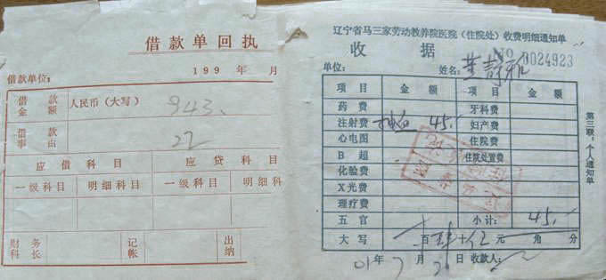 ![]() 马三家劳教所给董敬雅的“抽血”单据之一 |
