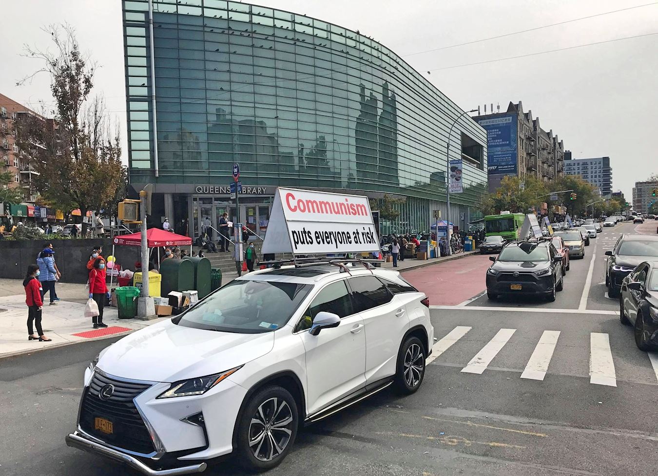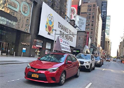 浩浩荡荡的车队从法拉盛出发,行经著名的大都会艺术博物馆、中央公园、美国自然历史博物馆和时代广场等景点,再到纽约中领馆前绕行,最后回到法拉盛缅街市中心。车顶上的中英文大型展板美观大方,醒目明确,上书“中共是真正的病毒源头”、“中共撒谎、人民死亡(CCP Lies, People Die)”、“Say NO to CCP, Keep SAFE from CCP Virus”(拒绝中共, 远离病毒)、“Communism puts everyone at risk”(中共把每个人都陷于危险之中)、“真善忍、法轮大法好”等,向广大民众传递着真相。