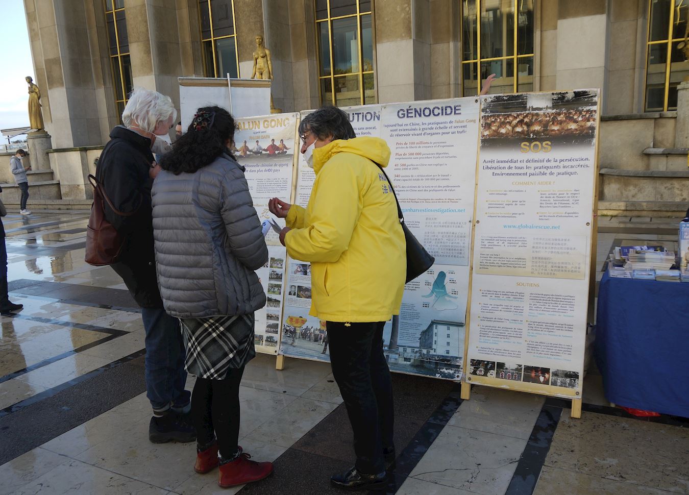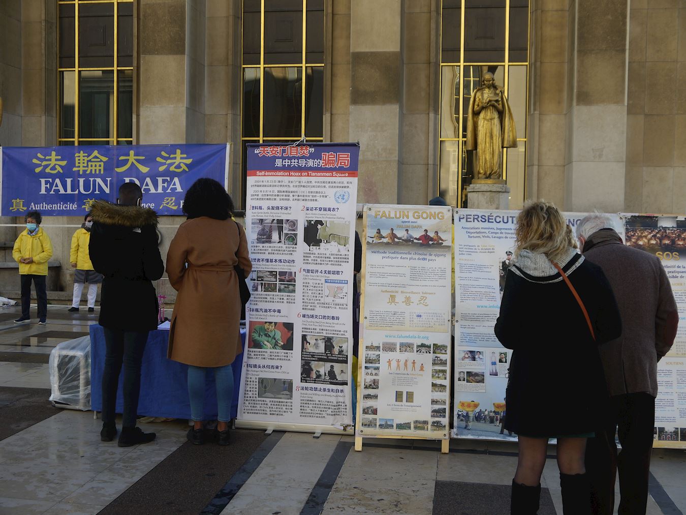 在巴黎的人权广场,星期天的下午,都会有法轮功学员举行的炼功和讲真相活动。