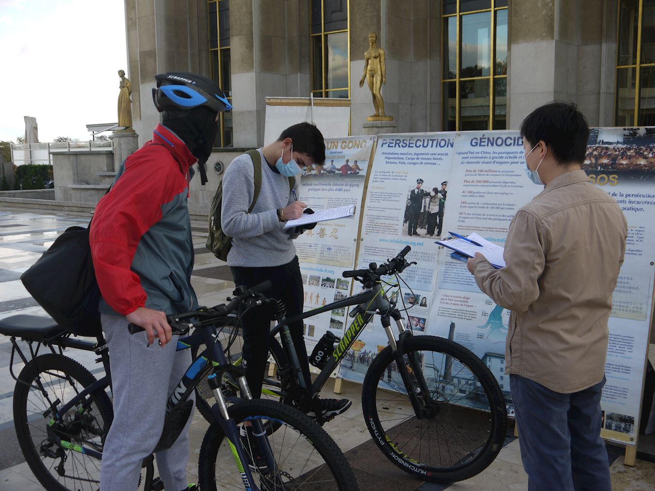 法国人斯特凡(Stephane)研究历史,他在美丽城遇到法轮功。他说:“我今天才知道,法轮功学员被迫害这么多年了。这里有我的一份责任在里边,尽管我没有最初的主要责任,但我穿的衣服可能是中国制造的,如果可能,我可以买别的产品,而不是买可怜的中国人受剥削和迫害制造出来的。”