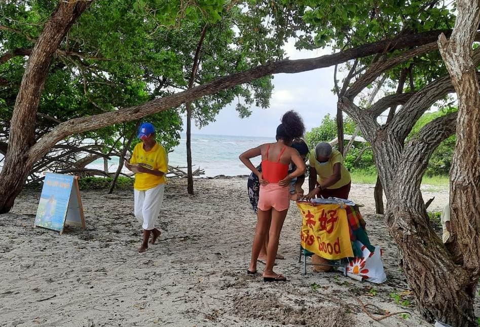 在法国海外省瓜德罗普,圣费利克斯(Saint-Félix )海滩常常吸引很多游人和当地民众。那是一个美丽的海湾,靠近红树林,栖息着很多种鸟类。每个月的第一个星期日,在海滩上都有法轮功讲真相的活动。