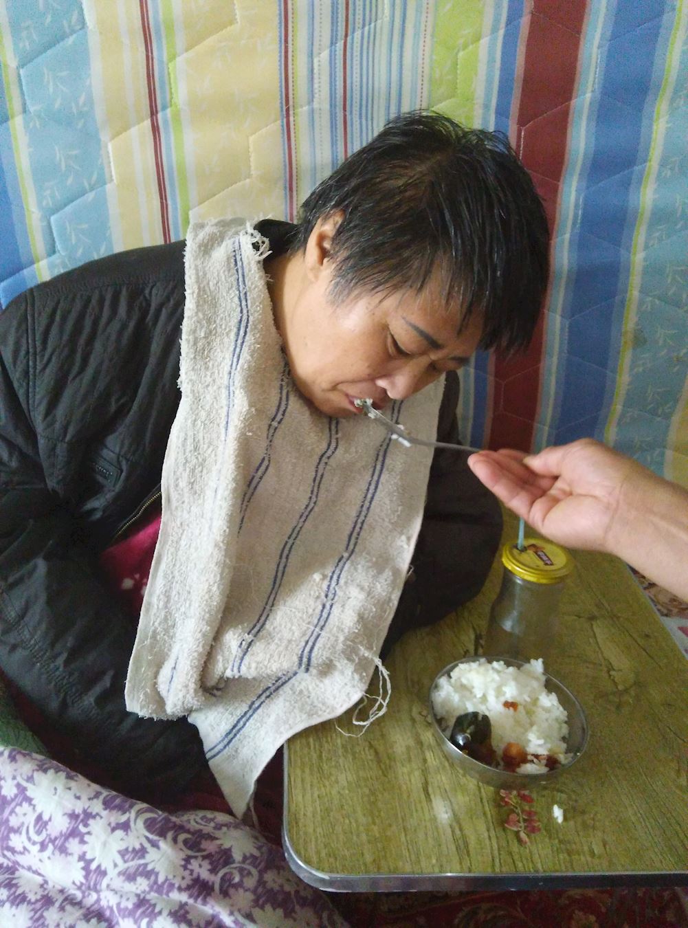 现在杜洪芳的身体被迫害的整个身子、手、脚、腿都失去了知觉,大、小便失禁,不能说话,嘴角每天一直不停的流着口水,一天24小时下身都穿着尿不湿,以方便随时更换,更为严重的是:杜洪芳下身连裤子都不能穿,每天24小时下身都光着身子,因为身体被迫害严重,在夏天三伏天里,捂着厚被子有时还冷的瑟瑟发抖,大、小便完全拉尿在床上,生活不能自理,吃饭完全靠丈夫郭云庆喂,一顿饭要吃很长时间,有时还喷的哪都是。
