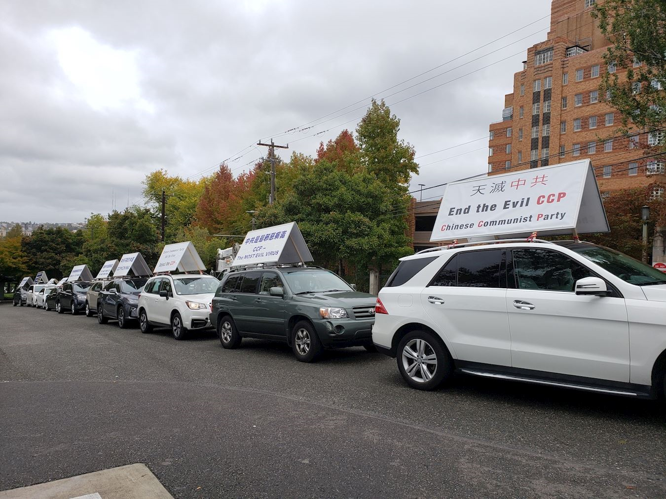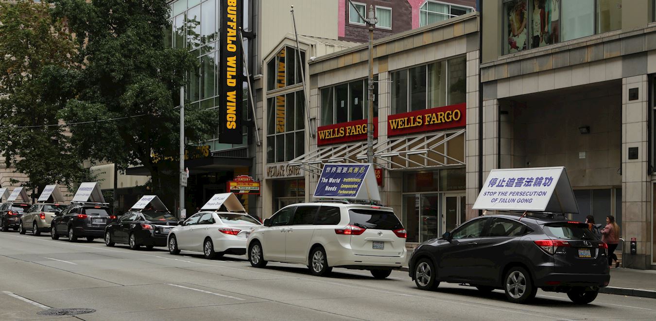黄瑞秋说:“我们12点多出发,先在中国城转了几圈。很意外,当时中国城人很多,车队停下来时,就会有人索要真相资料,小莲花也很受欢迎。当时印象比较深的是四个男学生样子的亚裔,背着相机,不停向我们竖大拇指;还有一位长者,手举《大纪元》报纸,不断向我们挥舞,生怕我们没看到他;到西雅图市中心时,看到很多西人拿出手机拍照。”