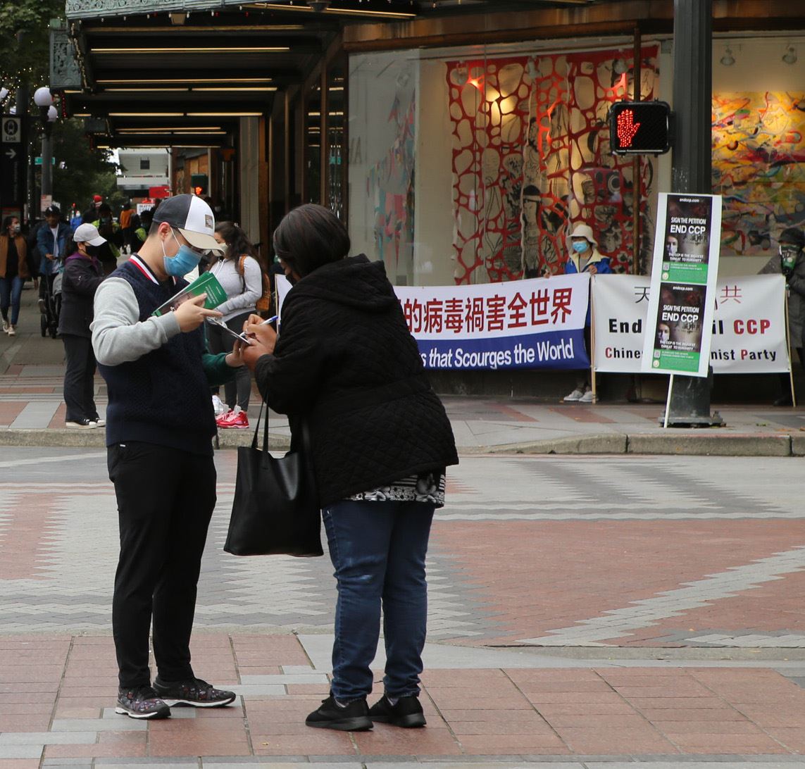 也有一位30多岁的白人,表示去过台湾,在那里看到法轮大法,“你们做的很好!”签了字后离开了。有位女士看到我们后非常兴奋,表示:“太爱中国人了,你们中国人很勤劳,就是(中共)政府不好。谢谢你们这样做。”在过了马路走出很远后还转过身来向学员们挥手告别。