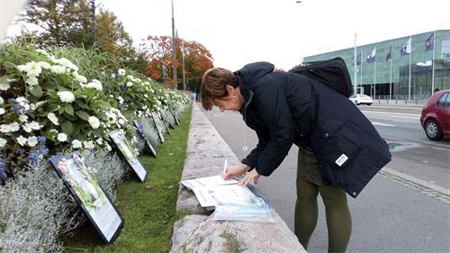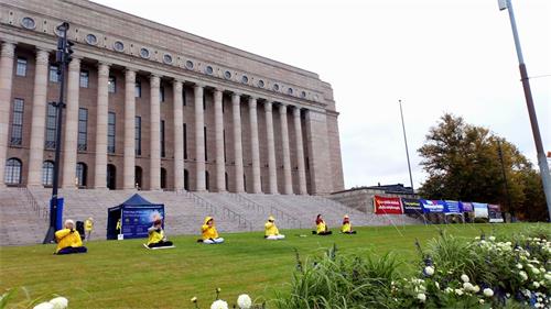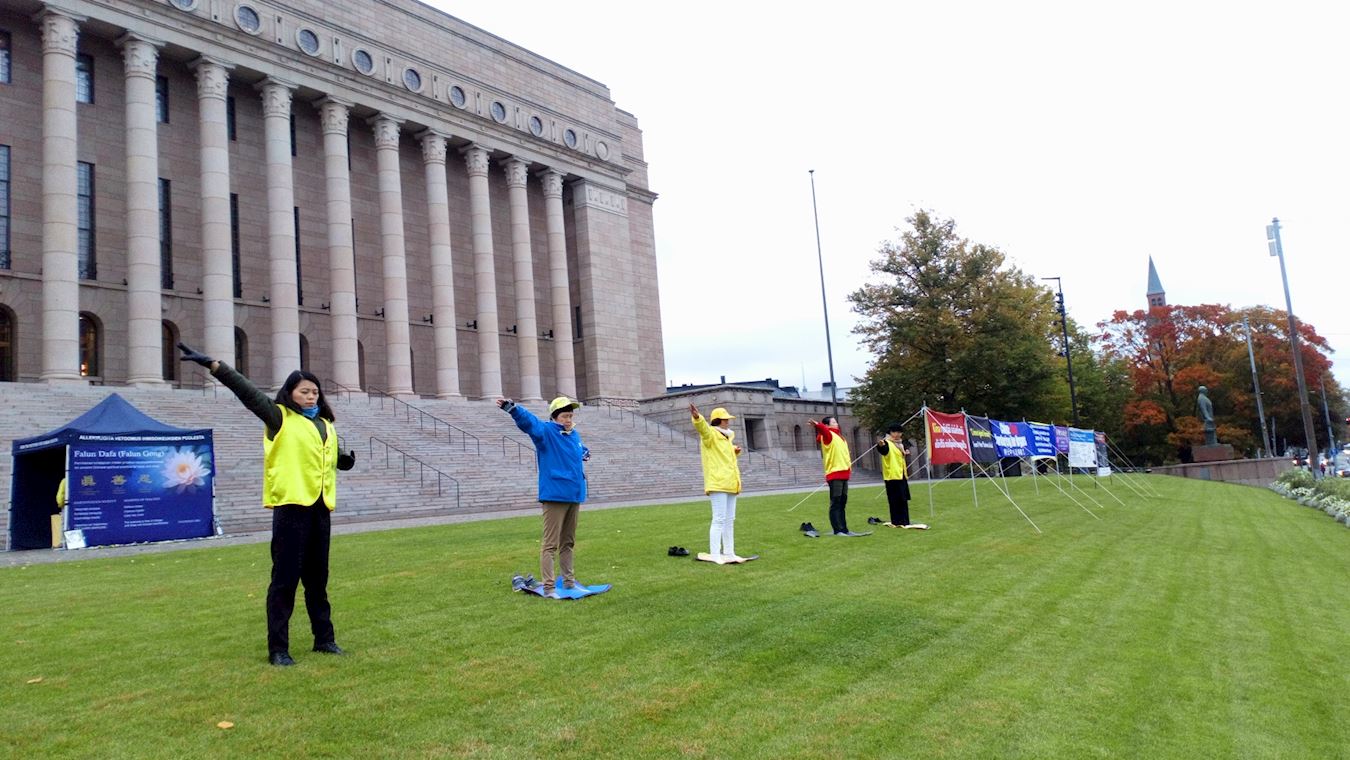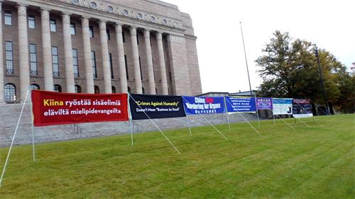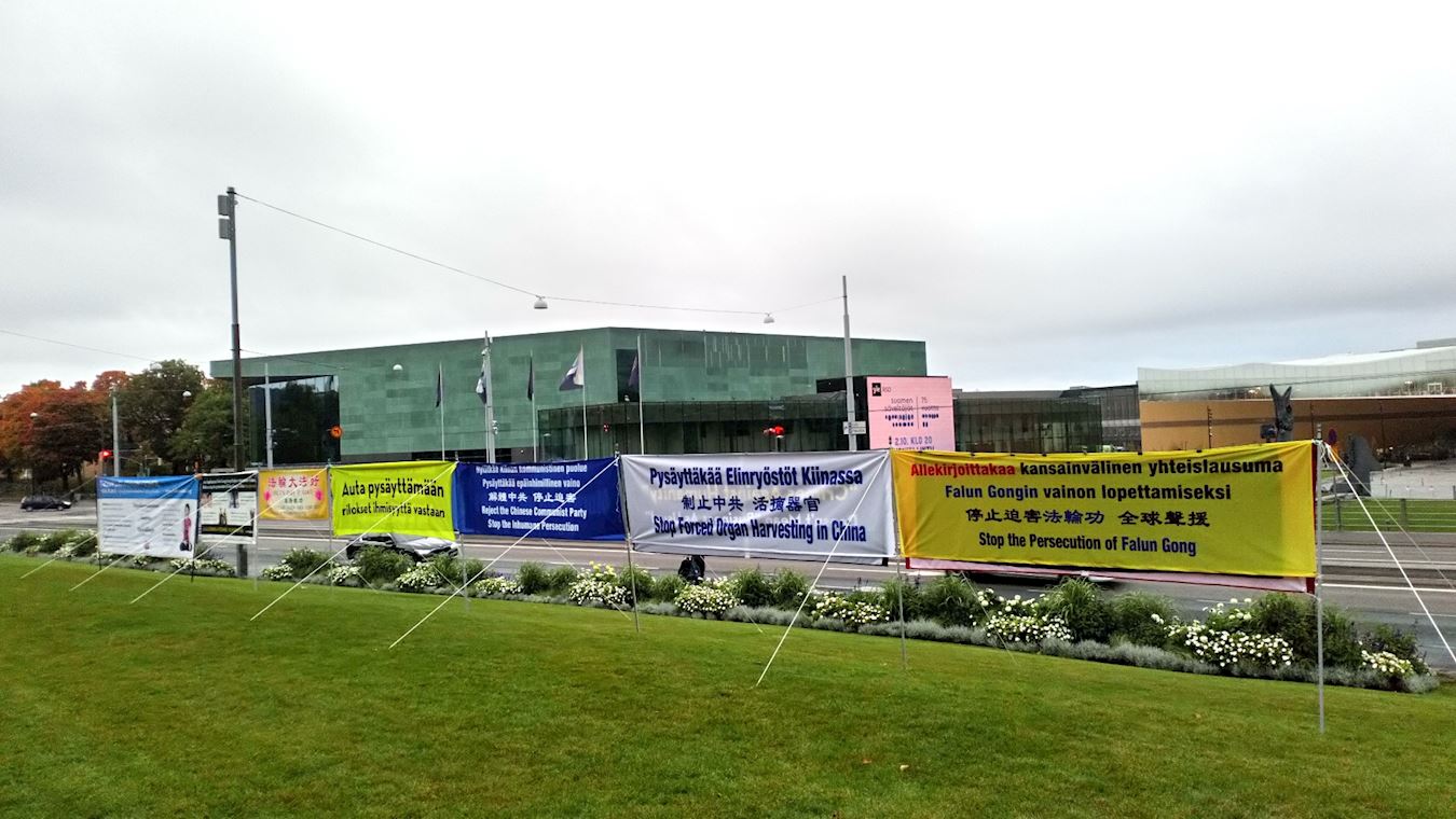 十月二十九日和三十日两天,学员来到芬兰的国会大厦前呼吁更多议员关注法轮功被残酷迫害甚至活摘器官,呼吁更多议员签署全球政要联合声明。国会大厦位于芬兰首都赫尔辛基的交通主干道边上,车水马龙。附近有火车总站,巴士总站,各大购物中心。很多人都能在远处或者在交通车上看见长达二十多米、非常醒目的横幅。