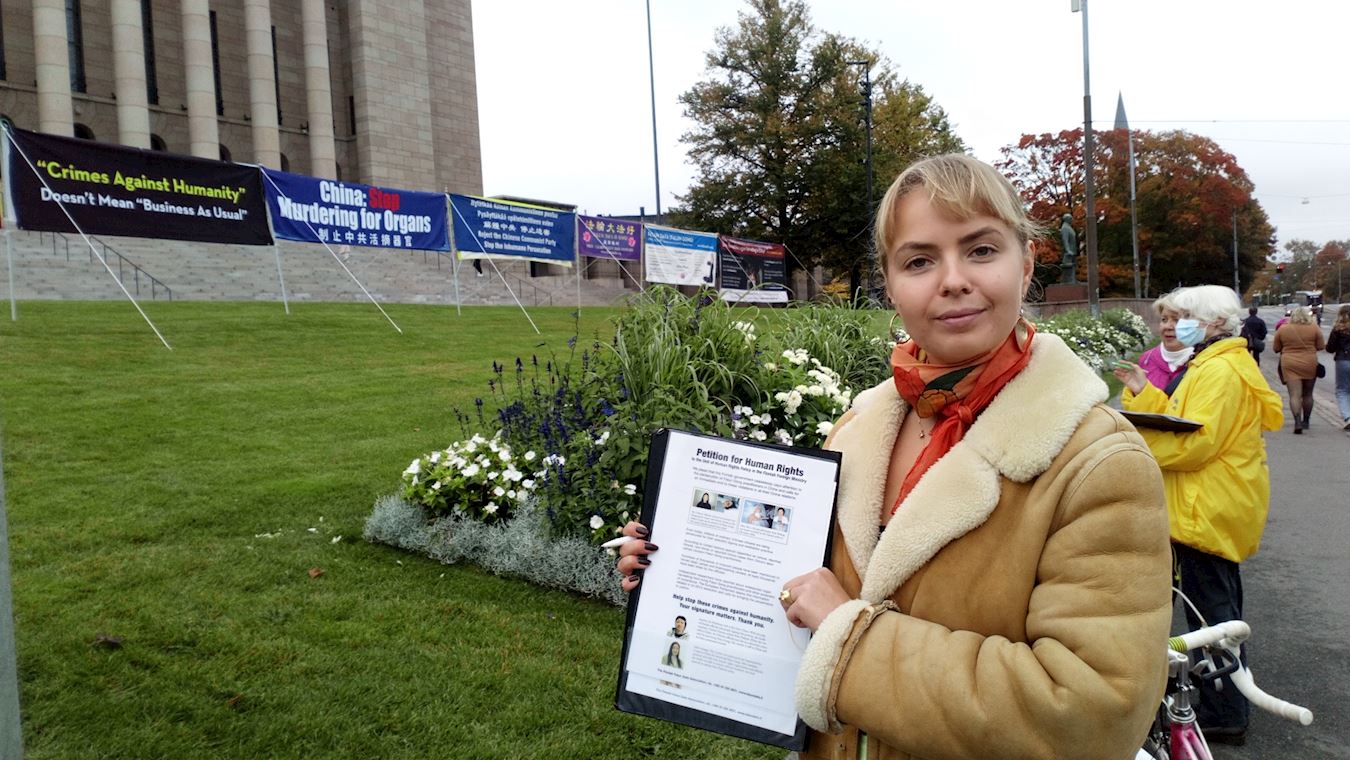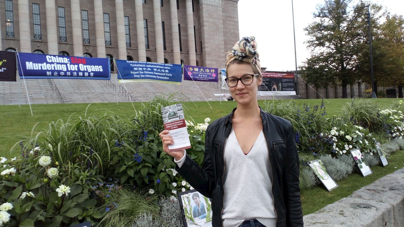 西尼(Sydney)是居住在芬兰的美国人。她正好带着不满一岁的宝宝出来散步看见法轮功学员的和平请愿。她照了很多相片,想回去告诉她的丈夫。但是她不明白为什么中共要迫害一群平和打坐的人。当她听到学员说国内很多学员被活体摘取器官,她忍不住惊呼。她非常感谢学员告诉她这么重要的事情,感谢学员们默默的付出与努力,并表示会把这些信息传递给更多的人。