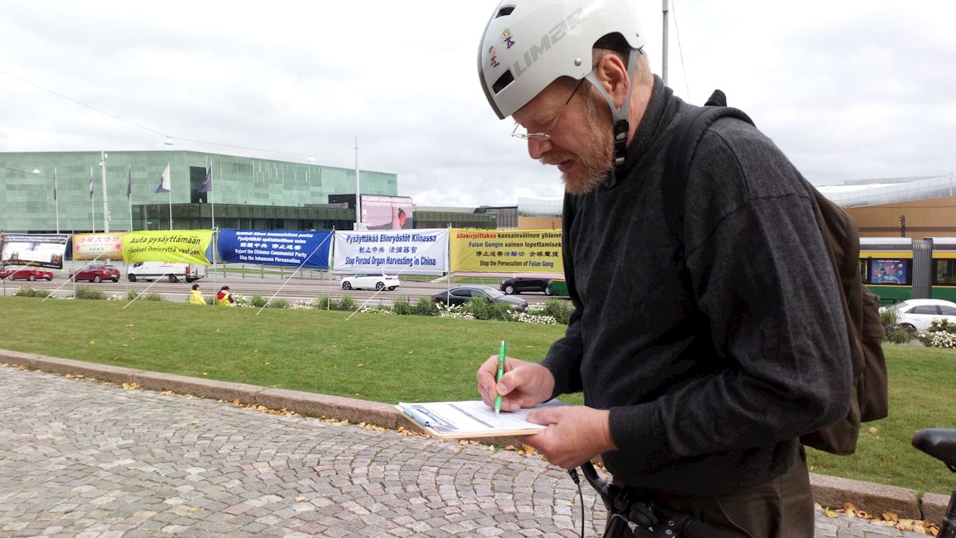 佩尔蒂(Pertti)也是一名摄影师。他骑着自行车直接到帐篷前,说:“我站在你们一边。”他告诉学员他对二零一七年中共党魁访问芬兰时,法轮功学员在附近立起横幅,呼吁停止迫害法轮功的场景,印象非常深刻。