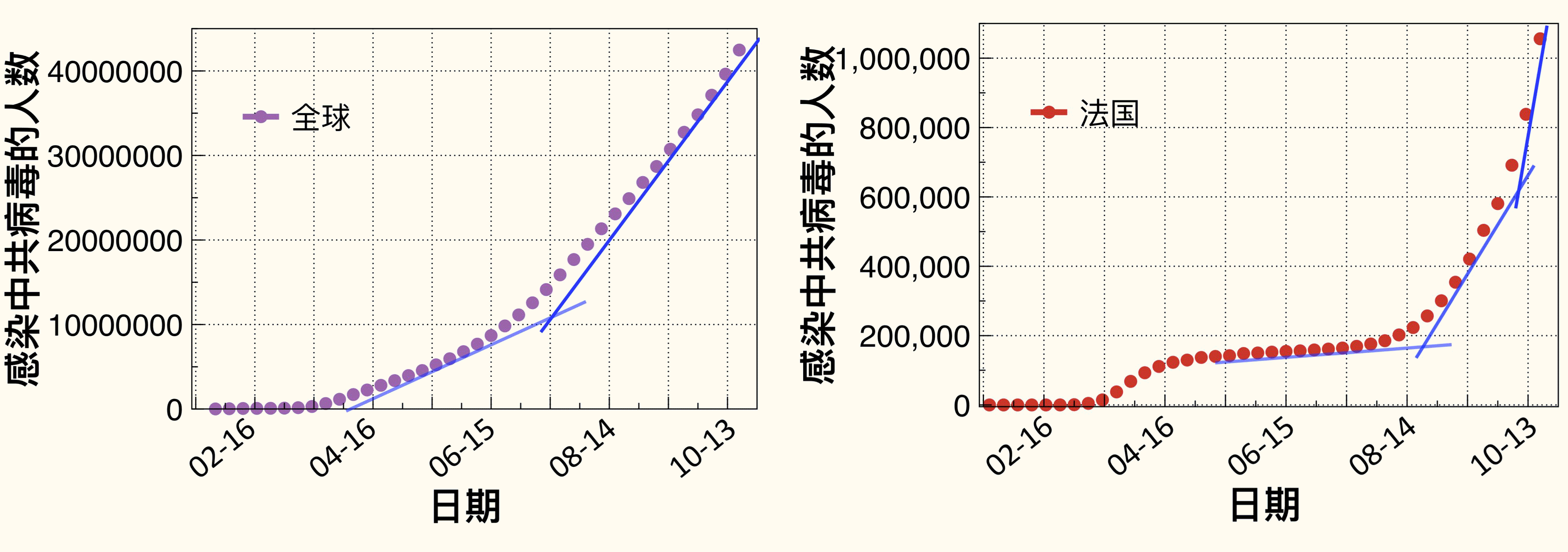 ![]() 图:全球感染中共病毒的人数曲线(左)以及法国感染中共病毒的人数曲线(右)。(每数值点间隔为一周累计感染人数,蓝色的切线斜率显示疫情扩散在加速。数据来源:WHO官网)。 |