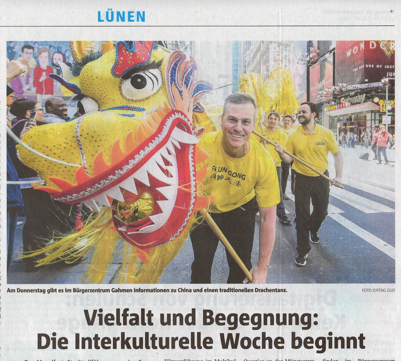【明慧网二零二零年十月四日】在明月高照,万家团圆之际,德国西部城市吕嫩市(Lünen)迎来国际文化周,法轮功学员和市民一起庆祝中秋节,并在月圆时刻舞起金色祥龙,当地《鲁尔日报》进行了预告和后续报道。